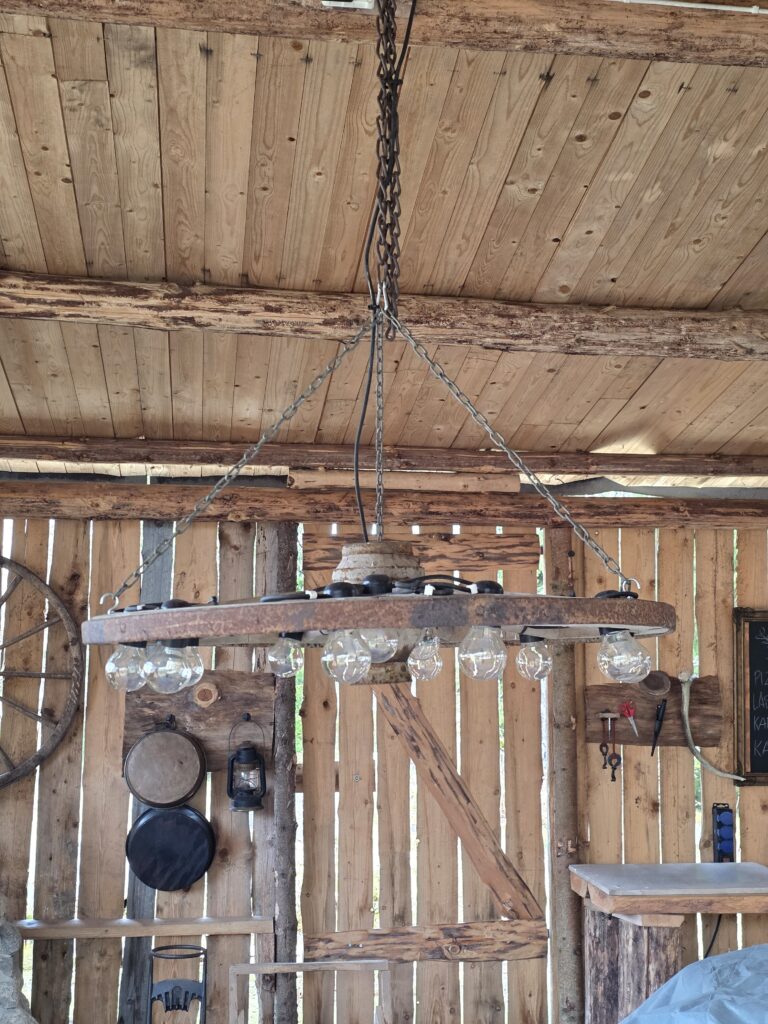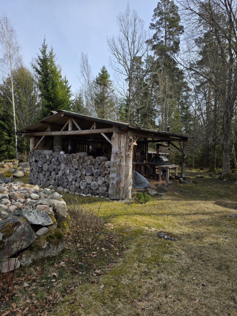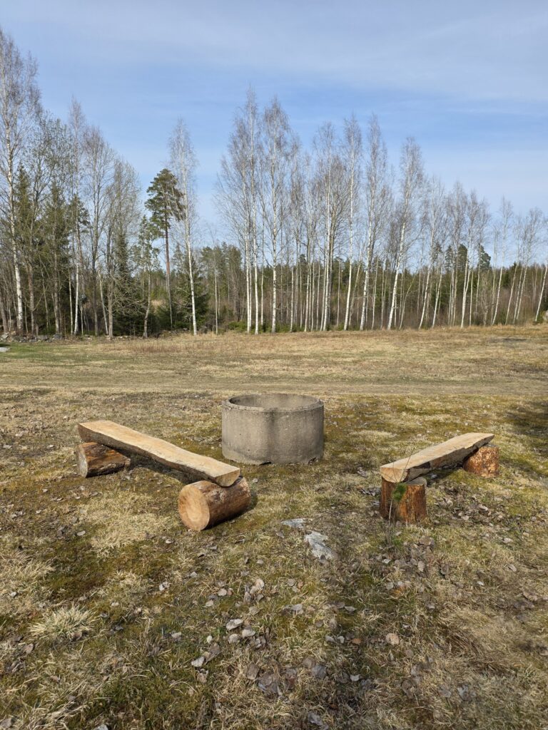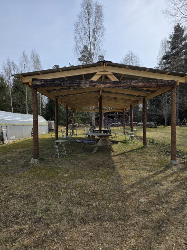 Det är inte en klassisk uppställd camping utan mer en plats där man får landan. Känslan är mer “stanna upp” än “checka in”. Runt omkring pågår det arbete. De har satt upp ett tak som man kan sitta under om solen lyser stakt eller om det regnar. De håller på att bygga en eldstad som kommer att bli kanonfin. Bra att veta är att ägarna har en fantastisk liten hund och det är hans hem och han vandrar omkring på området. Vi är gästerna!