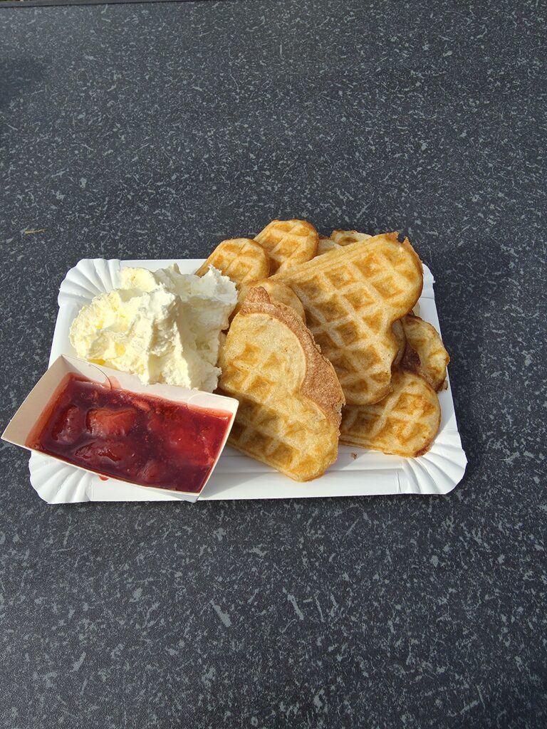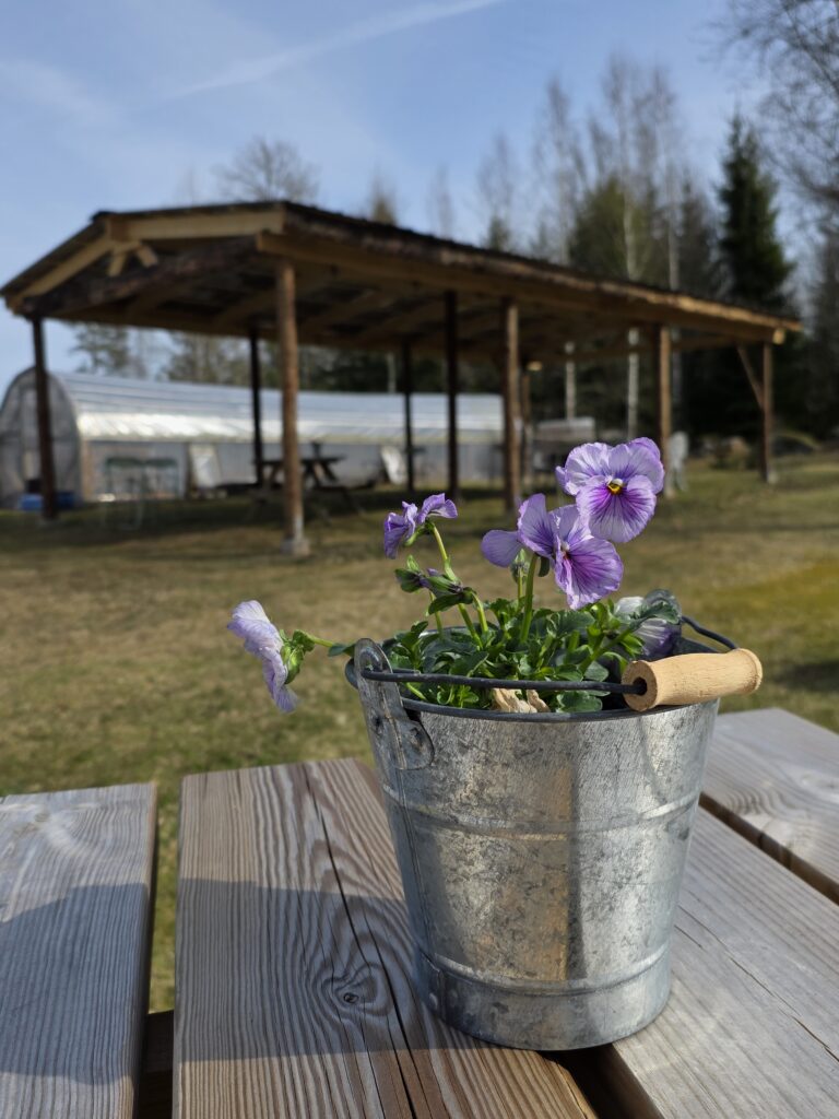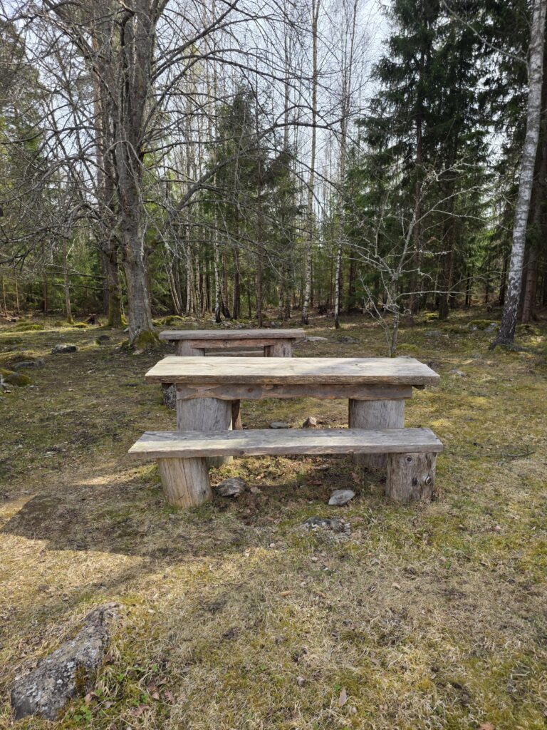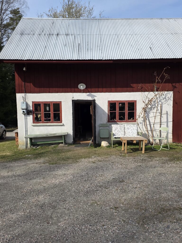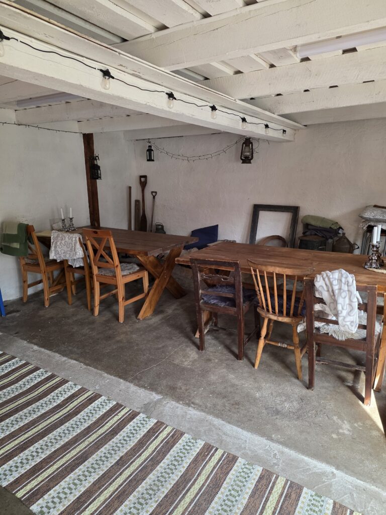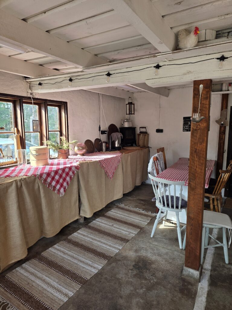 När man har köpt sitt fika finns det flera bord med bänkar att välja mellan och om det är lite kallt kan man sitta i ladan.
