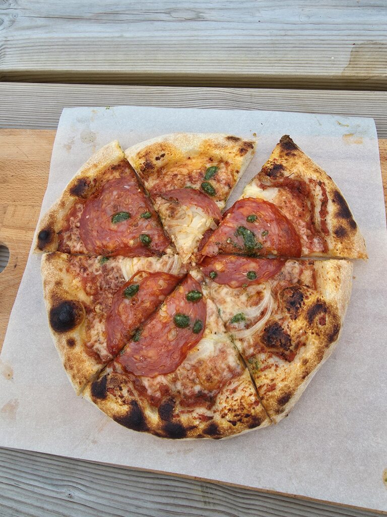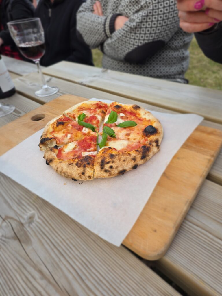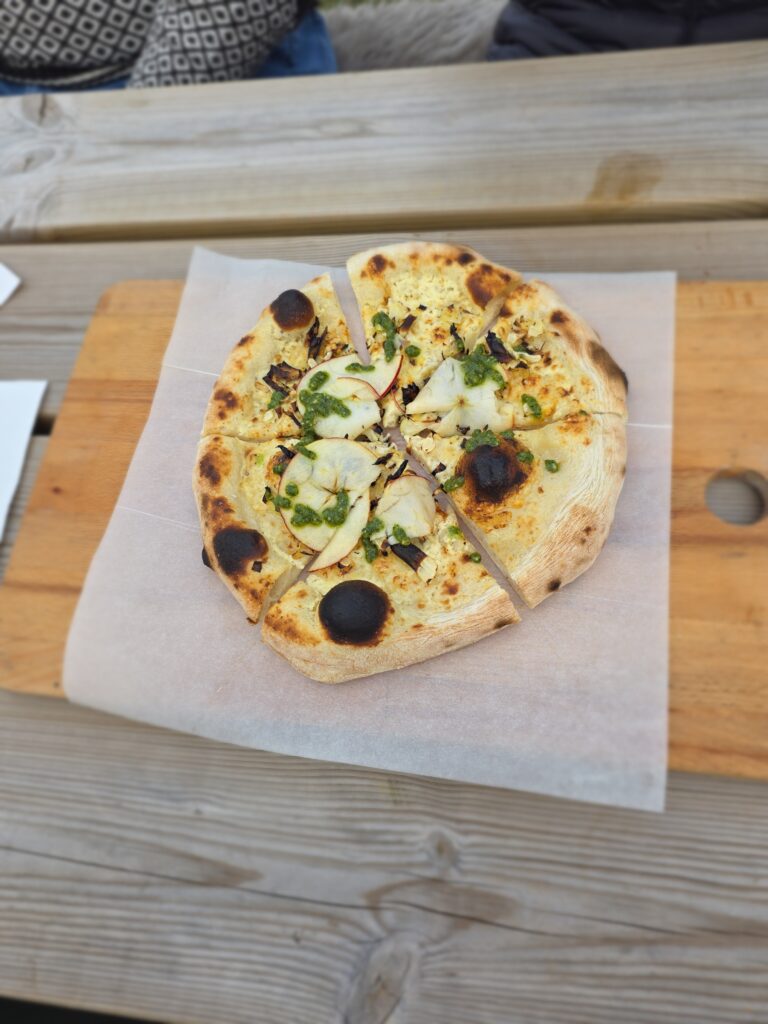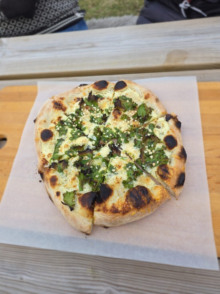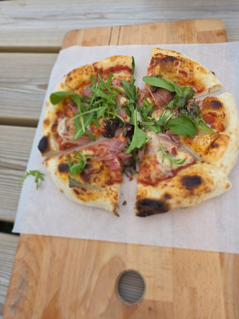 I bageriet gör det också fantastiska pizzor. Detta görs inte varje dag utan man måste hålla koll på deras sociala medier för att veta när. Vi hade turen att den kvällen vi var där körde de en pizzabuffe. Vi var 10 personer som satt tillsammans och det kom ut två pizzor i taget med olika toppning. Marie själv säger att det är bröd med pålägg och det stämmer så bra. Inga flottdrypande pizzor där inte, utan rena goda smaker på ett bröd.