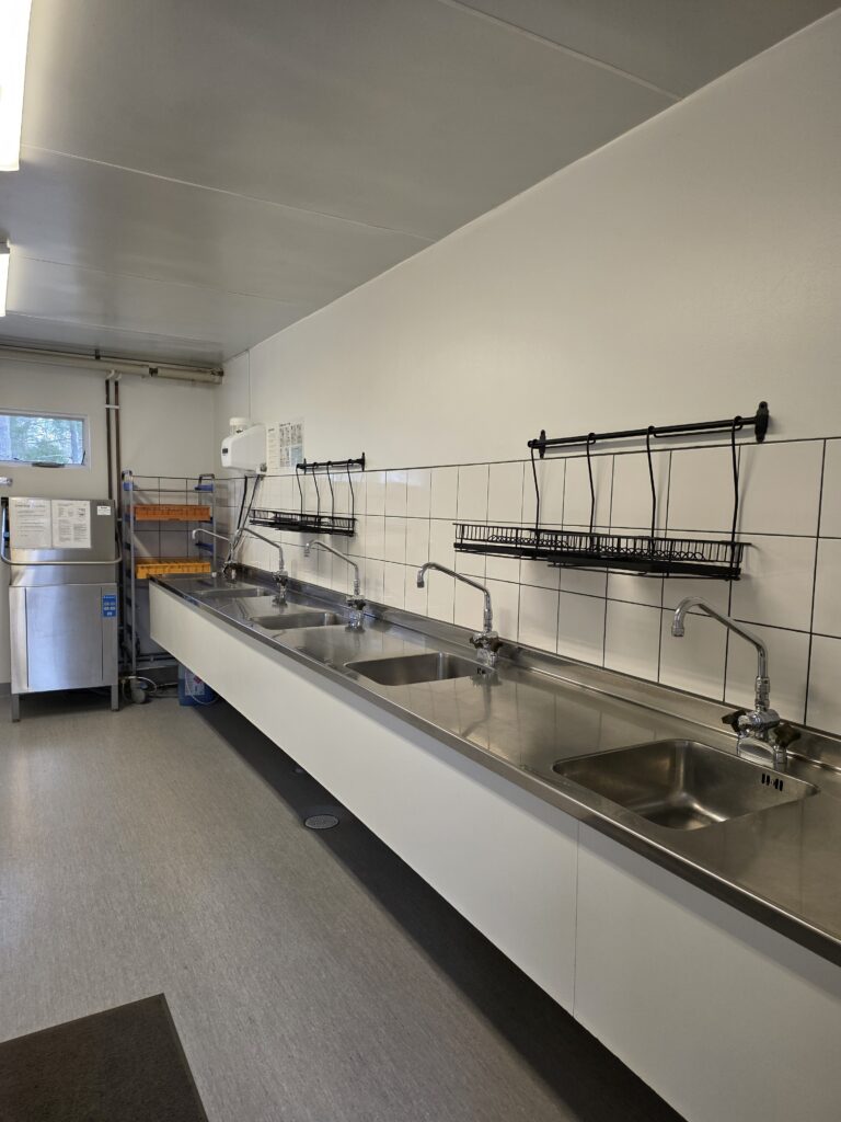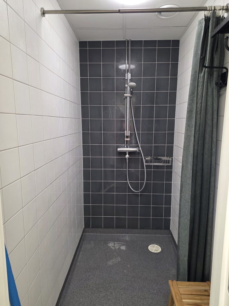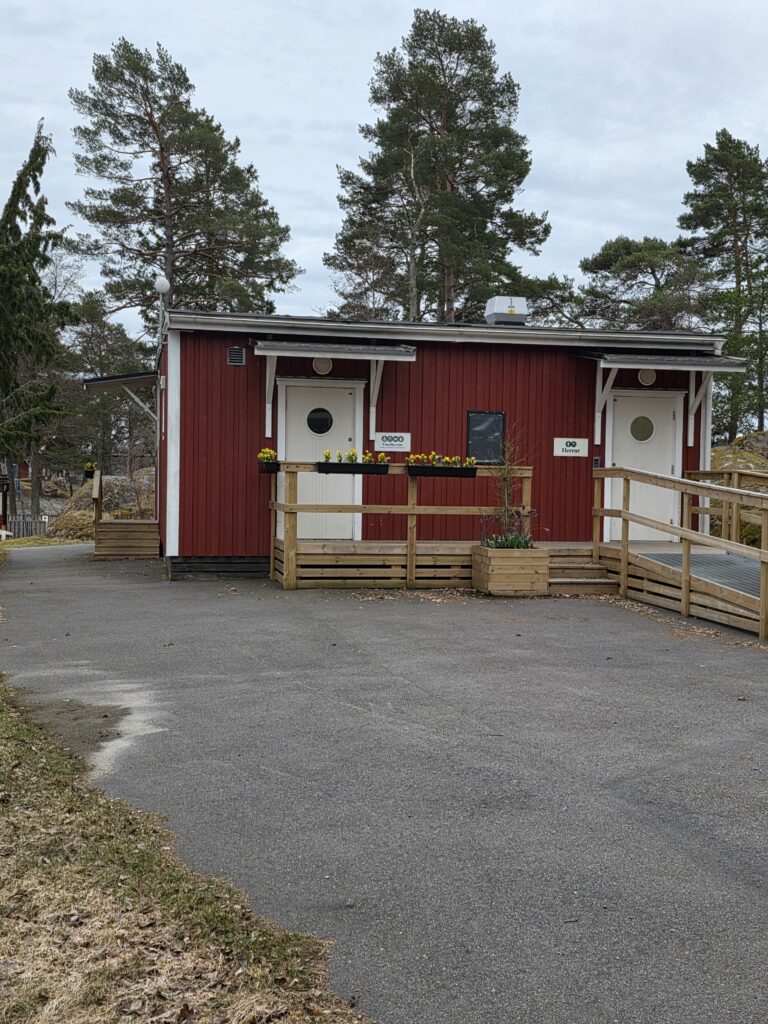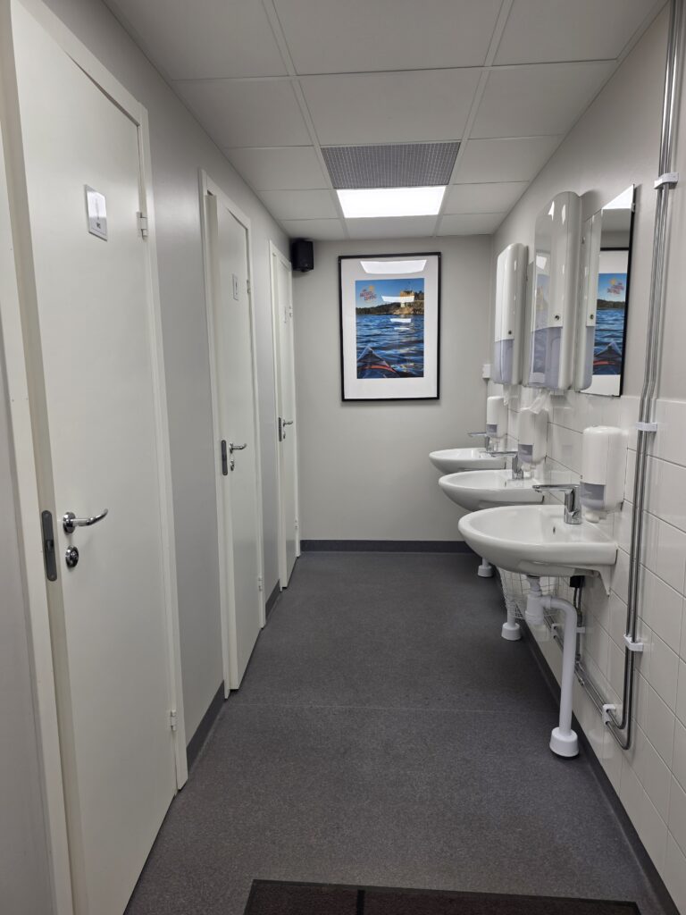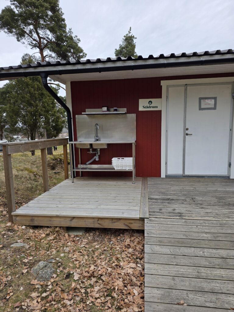 Det finns flera servicebyggnader på området men vi beskriver det som ligger närmast där vi stod. Servicehuset är superfint och känns som nyrenoverat, med välfungerande serviceutrymmen som toaletter och duschar, samt diskutrymmen, ett mindre kök för enklare matlagning och tvättmöjligheter som gör vistelsen både smidig och bekväm.